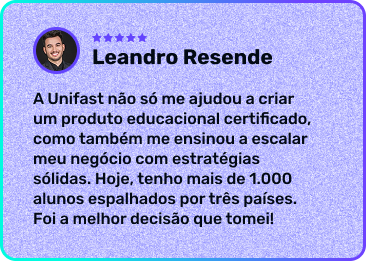 Nossos experts já impactaram mais de 100 mil alunos com seus programas educacionais certificados, transformando cursos livres em Pós-Graduações, MBAs e formações executivas de alto valor. Esses cases de sucesso mostram como a Unifast conecta inovação e credibilidade para criar resultados expressivos no mercado educacional.
